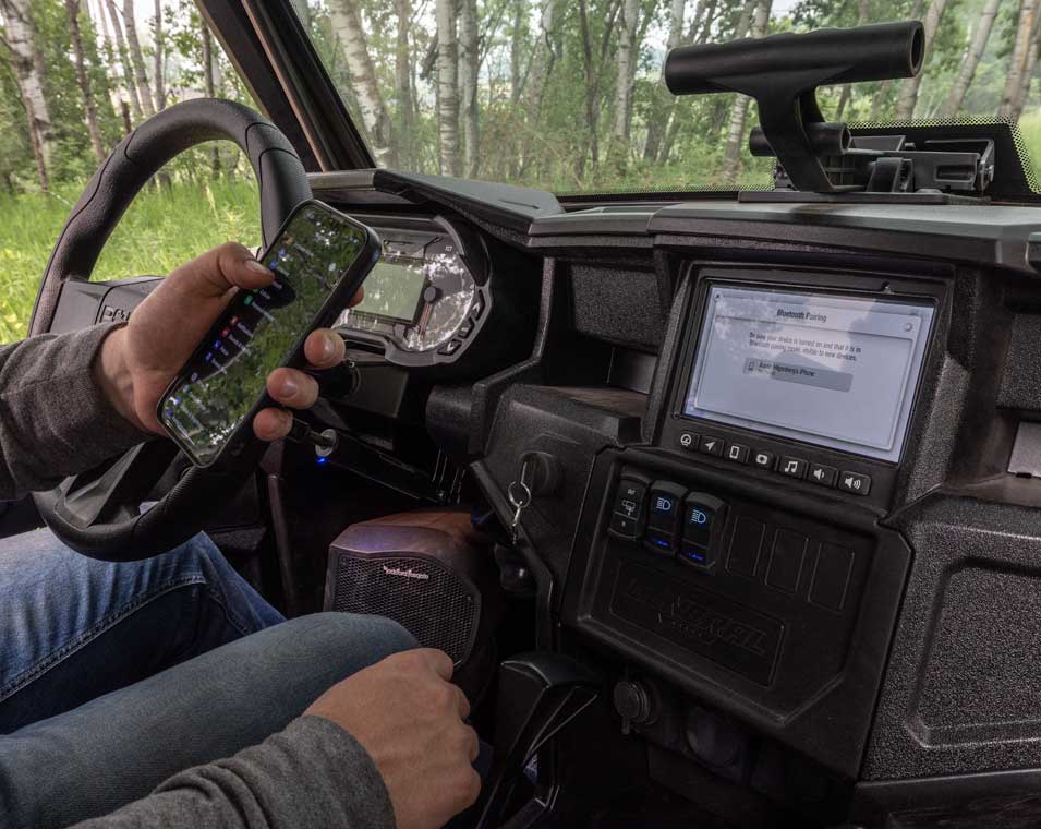 - Dual-sweep Analog Dials w/ 4" LCD Rider Information Center: User Selectable Blue/Red Backlighting & Brightness, Programmable Service Intervals, Speedometer, Tachometer, Odometer, Tripmeter, Clock, Hour Meter, Gear Indicator, Fuel Gauge, Coolant Temperature, Voltmeter, Service Indicator and Codes, Seat Belt Reminder Light, Gear Indicator, DC Outlet, POLARIS HD 4500 LB Winch w/ Synthetic Rope, Aluminum Fairlead & Rubber Isolator Sport Low Profile Front Bumper ProFit Sport Roof
